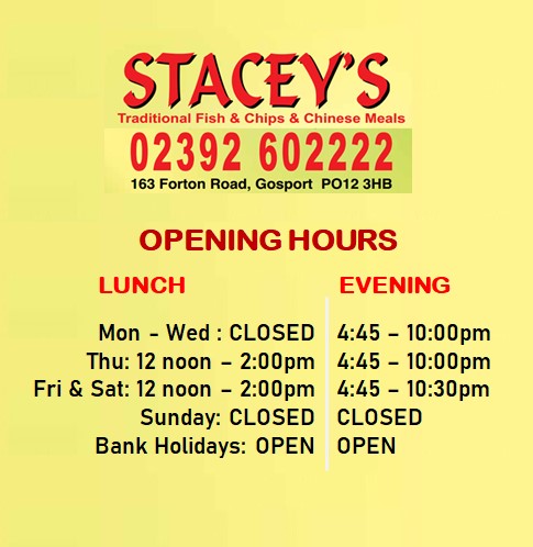 Stacey's Fish & Chips and Chinese Takeaway serves variety of delicious Chinese dishes. We’re passionate about delivering hot, great tasting, freshly prepared Chinese food to our customers